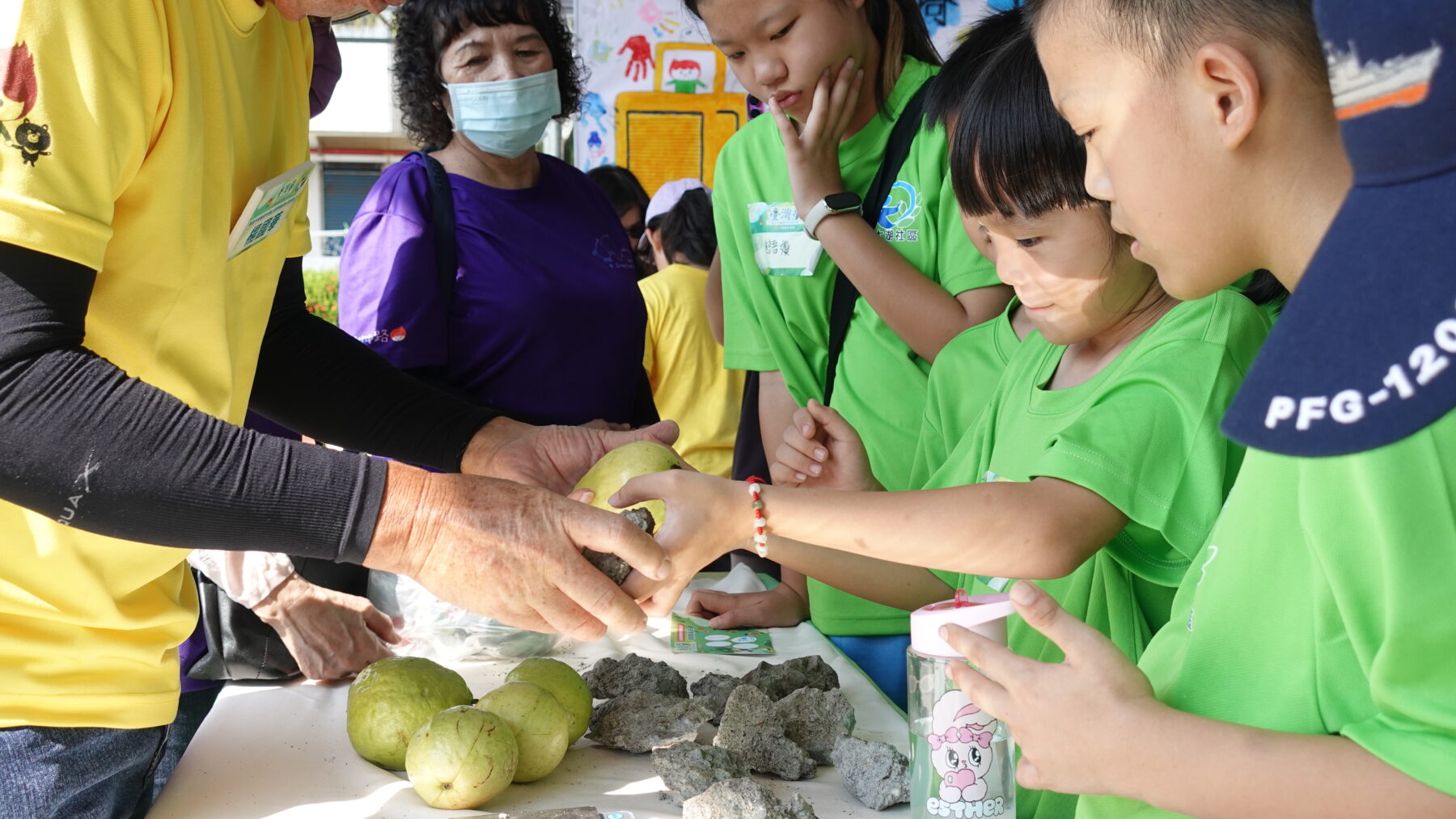 高雄中路社區特別從芭樂樹發想,將廢棄的樹枝再利用,帶著孩子們製作「芭樂樹枝餐具」,質樸可愛;現場還帶來徒手秤重的趣味小遊戲,只見社區大哥大姐輕輕一「踮」,就能準確猜出芭樂的重量,讓現場笑聲不斷。