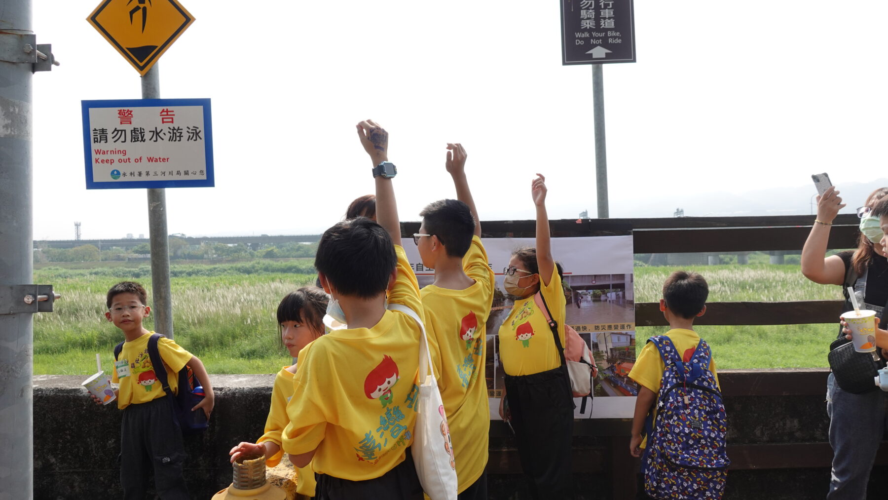 孩子們在麗芳姐的帶領下前往貓羅溪河堤,積極搶答了解有關自主防災的故事。