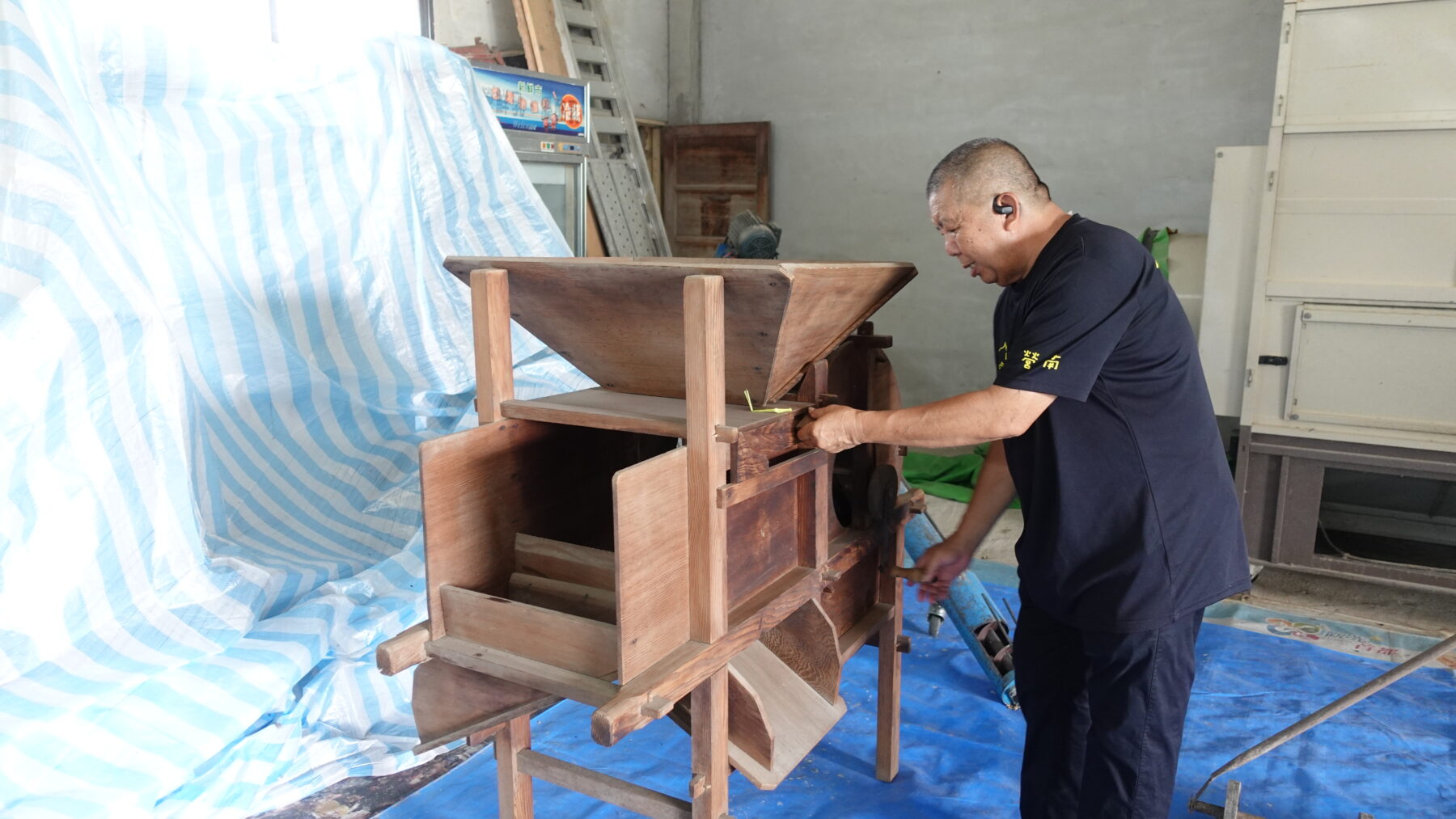 碾米廠內還留有早期木製的手動風鼓機,莊爺爺邊講邊示範操作