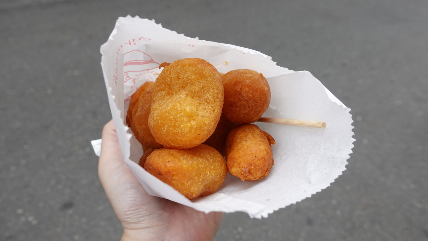 午後時分,市場口傳來陣陣香氣,地瓜球在油鍋裡咕嚕作響。「這是社區孩子最愛的下午點心,今天特地準備給各地的小朋友嚐嚐。」志工笑著說。