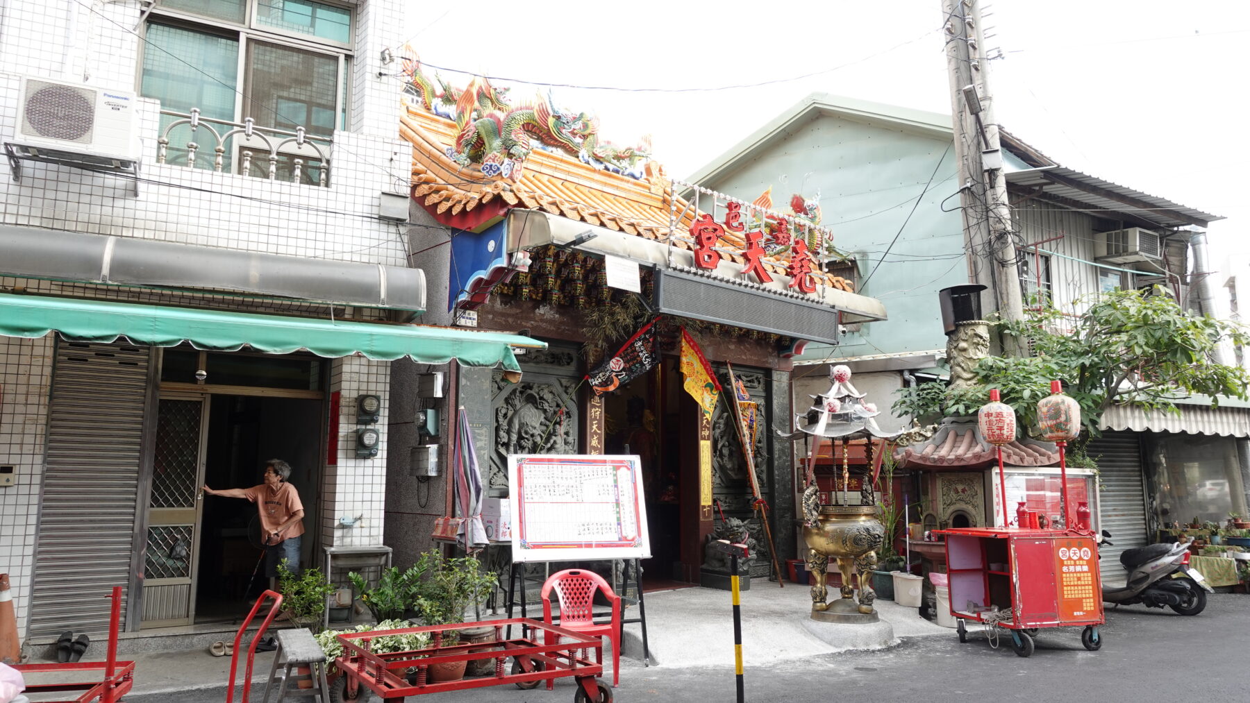 沿著巷口繼續前行,一棟留有太子樓的木造老屋靜靜佇立,鑼鼓聲正從另一頭傳來——那裡是嘉邑堯天宮,社區信仰的中心。主委熱情地介紹:「我們這裡很多人早年是從東石搬過來的,所以主祀五府千歲。」據傳神像分靈自臺南南鯤鯓代天府,因此每年都會舉行回南鯤鯓刈香的傳統儀式。