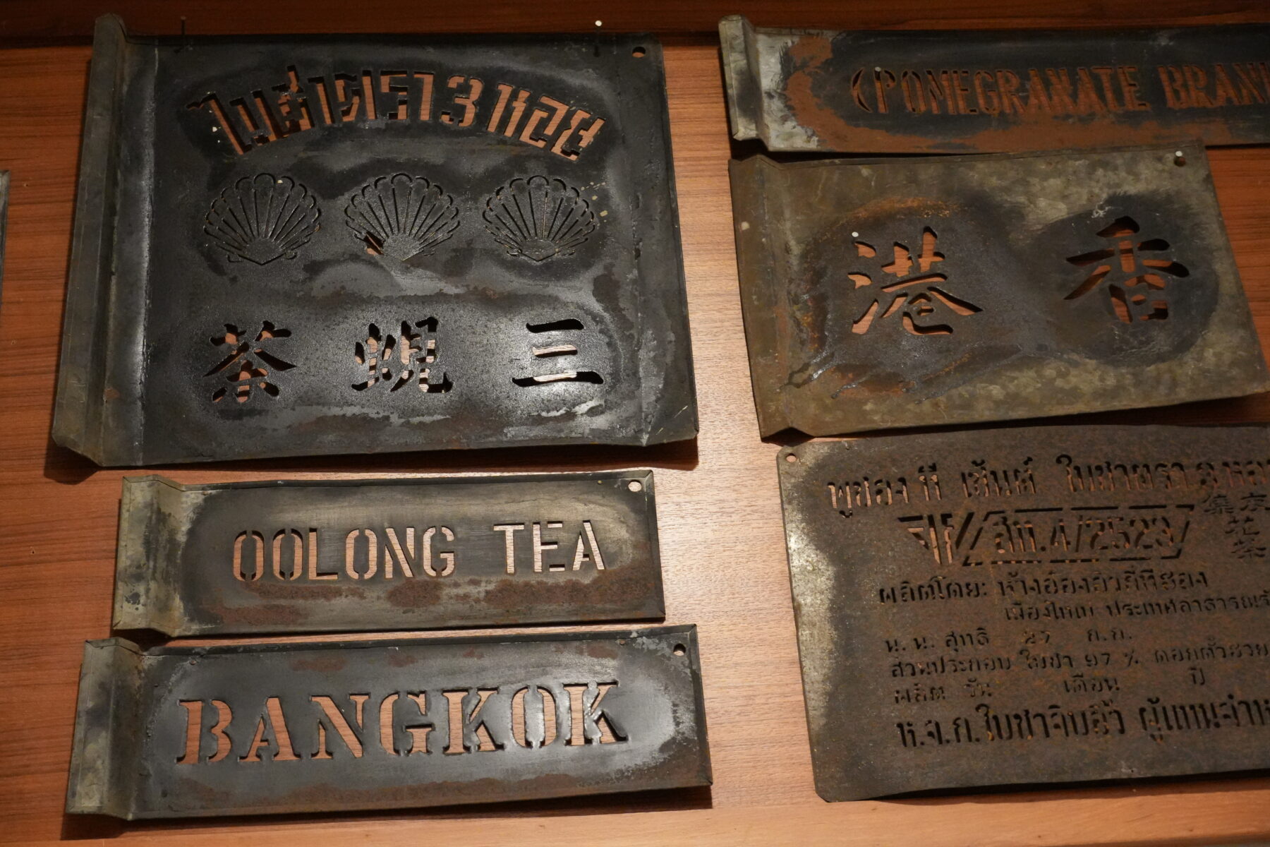 除此之外,廠內也留有許多珍貴的老物件,像是早期外銷茶葉用的箱子,由木片與竹片製成,外頭會刷上「嘜頭」(英文 mark),標示有記名茶、合作商家名稱與商品資訊,每一箱都像一段被封存的時光膠囊箱。